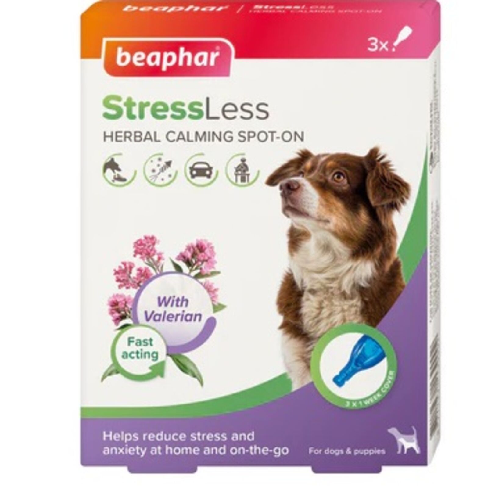 A Beaphar Calming Spot On kutyáknak természetesen és hatásosan nyugtatja kutyáját és csökkenti kedvence viselkedési problémáit. Valeriána (macskagyökér) kivonatot tartalmaz. Egyszeri alkalmazásának akár egy hétig is eltarthat a nyugtató hatása. A Beaphar Calming Spot On kutyáknak segíthet bizonyos problémák enyhítésében, mint például a túlzott ugatás, engedetlen magatartás és a nem megfelelő jelölés. Segíteni fog, hogy kutyája kevésbé féljen a nehezebb helyzetekben, például az állatorvos látogatásánál, ketrecben, tűzjáték idején, viharok esetén, kocsiban való utazáskor vagy költözéskor.