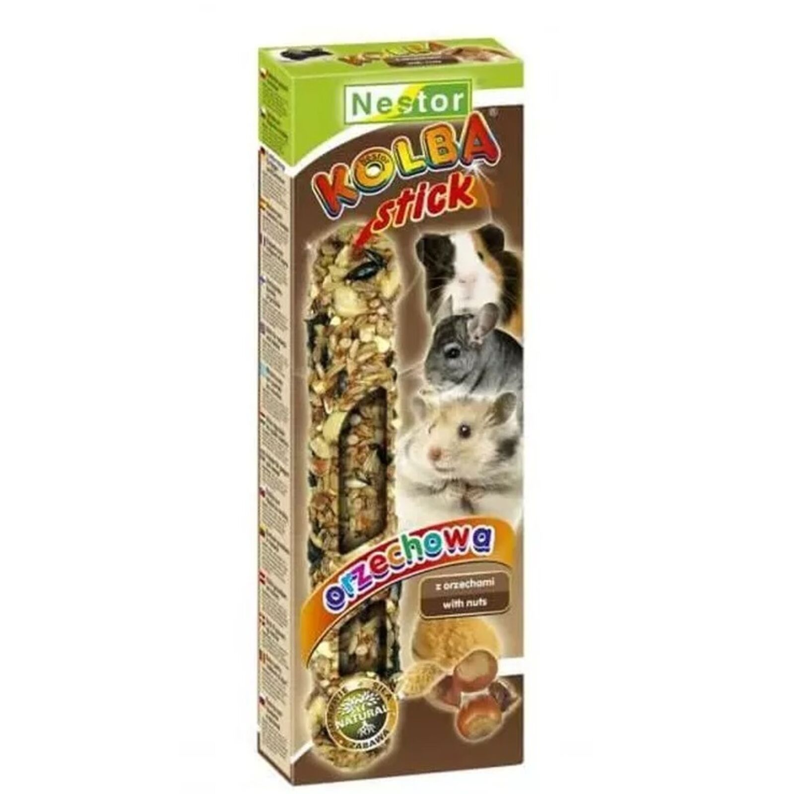 A rágcsálóknak és nyulaknak készült mogyorós Nestor dupla rúd egy kivételes eledel, amelyet kifejezetten úgy alakítottak ki, hogy megfeleljen kis kedvence igényeinek és ízlésének. Kiváló forrása a jó egészséghez és a megfelelő növekedéshez nélkülözhetetlen vitaminoknak, nyomelemeknek és ásványi anyagoknak. A rúdnak egy fa közepe van, amely segít koptatni kedvence fogait. Lehetővé teszi a háziállatok számára, hogy maguk csipegessék le a magokat, akárcsak a vadonban. Az „etetés” szórakoztatóvá válik, és boldoggá teszi kedvencét.