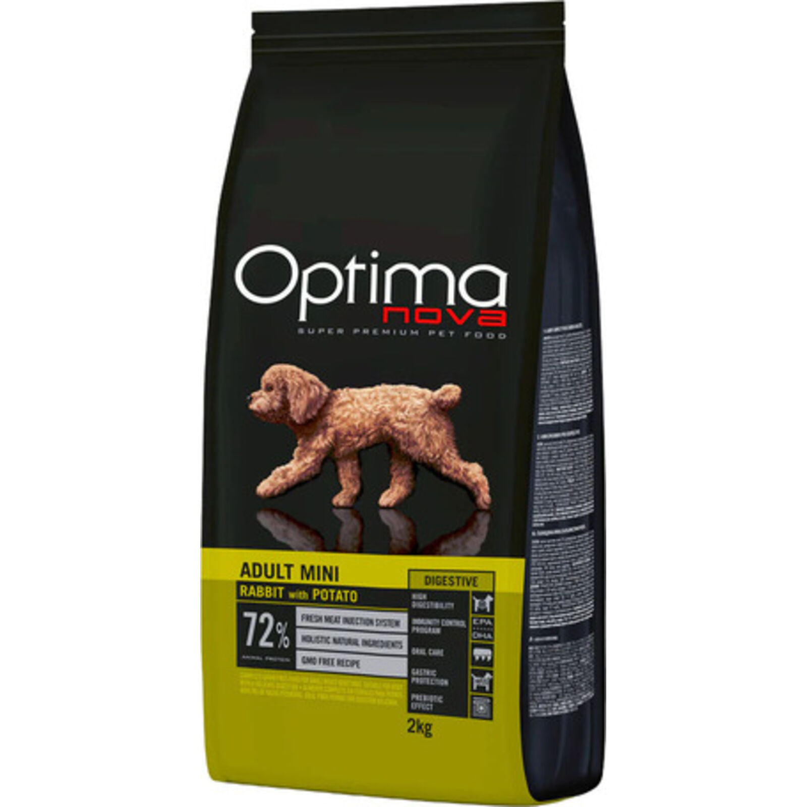 A Visán Optimanova Dog Adult Mini Rabbit & Potato (27/17) gabonamentes táp kiváló választás kistestű kutyák számára.